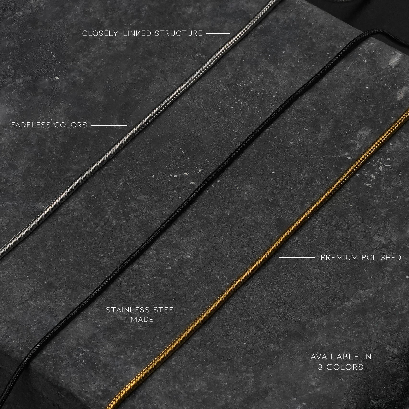 A sleek and modern accessory for everyday wear. The finely crafted links form a smooth, round snake-chain design that adds subtle sophistication and versatility to any outfit.